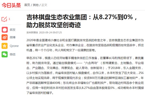 近日,棋盘生态农业集团的脱贫攻坚工作及爱心公益奉献的事迹,被吉林市委网信办以“爱心企业 耀江城”为主题进行推荐,由吉林新媒体在今日头条上做了《吉林棋盘生态农业集团:从8.27%到0%,助力脱贫攻坚创奇迹》的特别报道。 2020年是全面建成小康社会和全面打赢脱贫攻坚战的收官之年,吉林棋盘生态农业集团作为省级重点农业产业化龙头企业、村办集体企业,在脱贫攻坚狙击战和疫情防控攻坚战中,抓住机遇,用一个个行动,向党和人民交了一份满意的答卷。 早在2017年,棋盘人已经开始着手精准扶贫的工作准备,在董事长冯利伟的带领下,勇挑重担,助力脱贫攻坚。通过输出棋盘模式——“六合两动”(即党建聚合、土地整合、平台组合、产业融合、文化耦合、民意契合、能人带动、创新驱动),于2018年,引入金融支持,以乡村振兴为落脚点,向省级贫困村输入棋盘模式,合作以来,永丰村发生了巨大变化,256公顷土地实现流转,用于规模发展现代农业;投资800万元建设的鲜榨豆油加工基地投产,年产非转基因鲜榨豆油400吨;东北袜业永丰缝制分厂也顺利投产,带动周边村民百余个就业岗位,如今,永丰村的贫困发生率从8.27%自由落体般降至0%,成功帮助永丰村摘掉了省级贫困村的帽子。