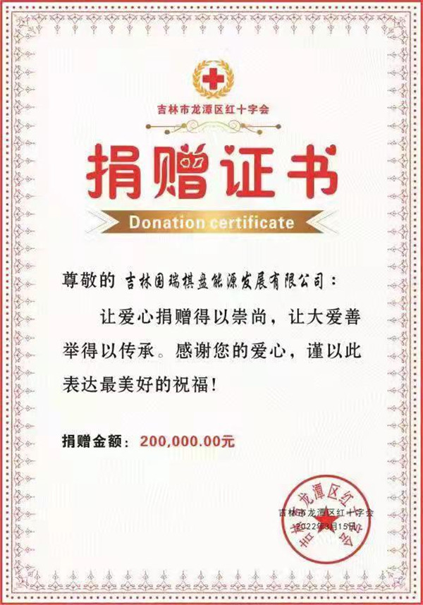 3月15日,吉林国瑞棋盘能源发展有限公司总经理冯利伟代表企业向龙潭区红十字会捐款20万元。冯利伟表示“以实际行动践行奉献和担当精神,为疫情防控贡献民企力量,与全市人民并肩作战抗击疫情,是吉林国瑞棋盘能源作为吉林本土企业义不容辞的责任。同时向所有奋战在抗疫一线的逆行者表示敬意。” 据了解,2022年年初,山东国瑞能源集团同吉林棋盘生态农业集团达成战略合作,双方共同成立吉林国瑞棋盘能源,注册资本金1亿元。在社会各界的大力支持下,公司已同龙潭区政府签约合作开展农光互补、牧光互补、渔光互补类新能源项目,未来目标布局吉林全域。
