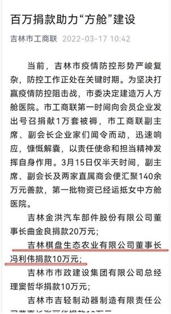 与此同时,冯利伟代表吉林棋盘生态农业有限公司向吉林市工商联捐款10万元,积极响应吉林市工商联向民营企业发出的号召,助力吉林市方舱医院建设。